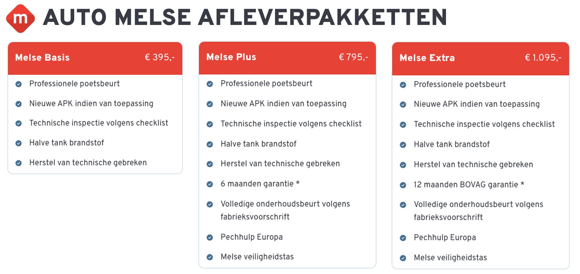 • Melse Basis (€ 395): Bij het afleverpakket Basis wordt de auto gecontroleerd aan de hand van een checklist. Eventuele gebreken worden in orde gemaakt. De checklist ontvangt u bij aflevering en wordt met u doorgenomen. Bovendien wordt de auto voorzien van een nieuwe APK-keuring. De auto krijgt een volledige poetsbeurt en heeft bij aflevering brandstof tussen 1/4 en 1/2 tank.