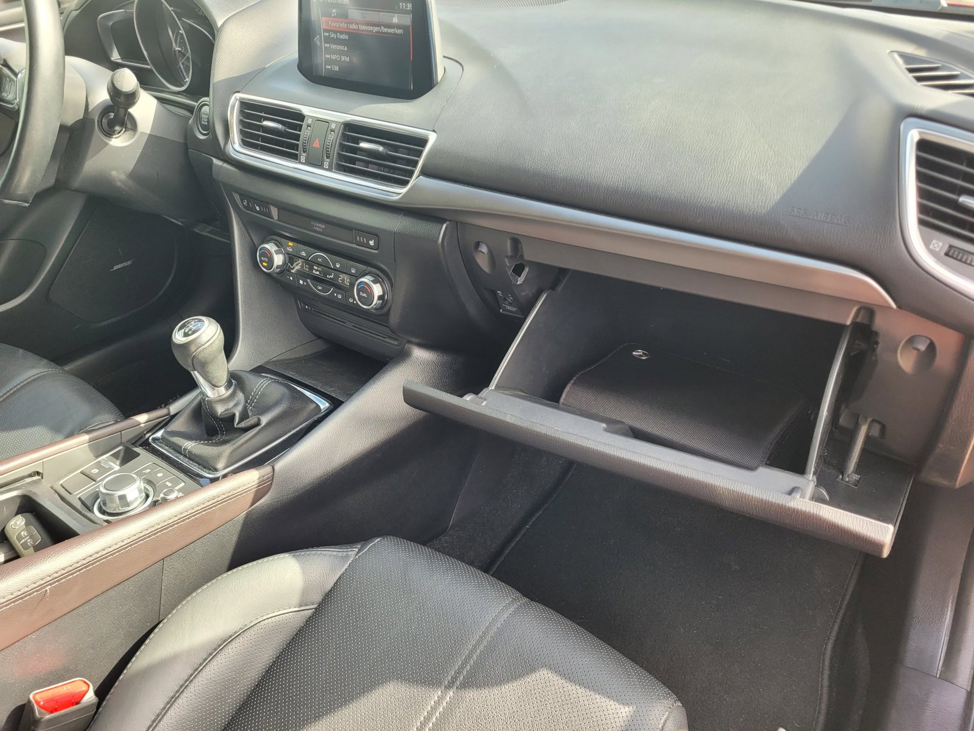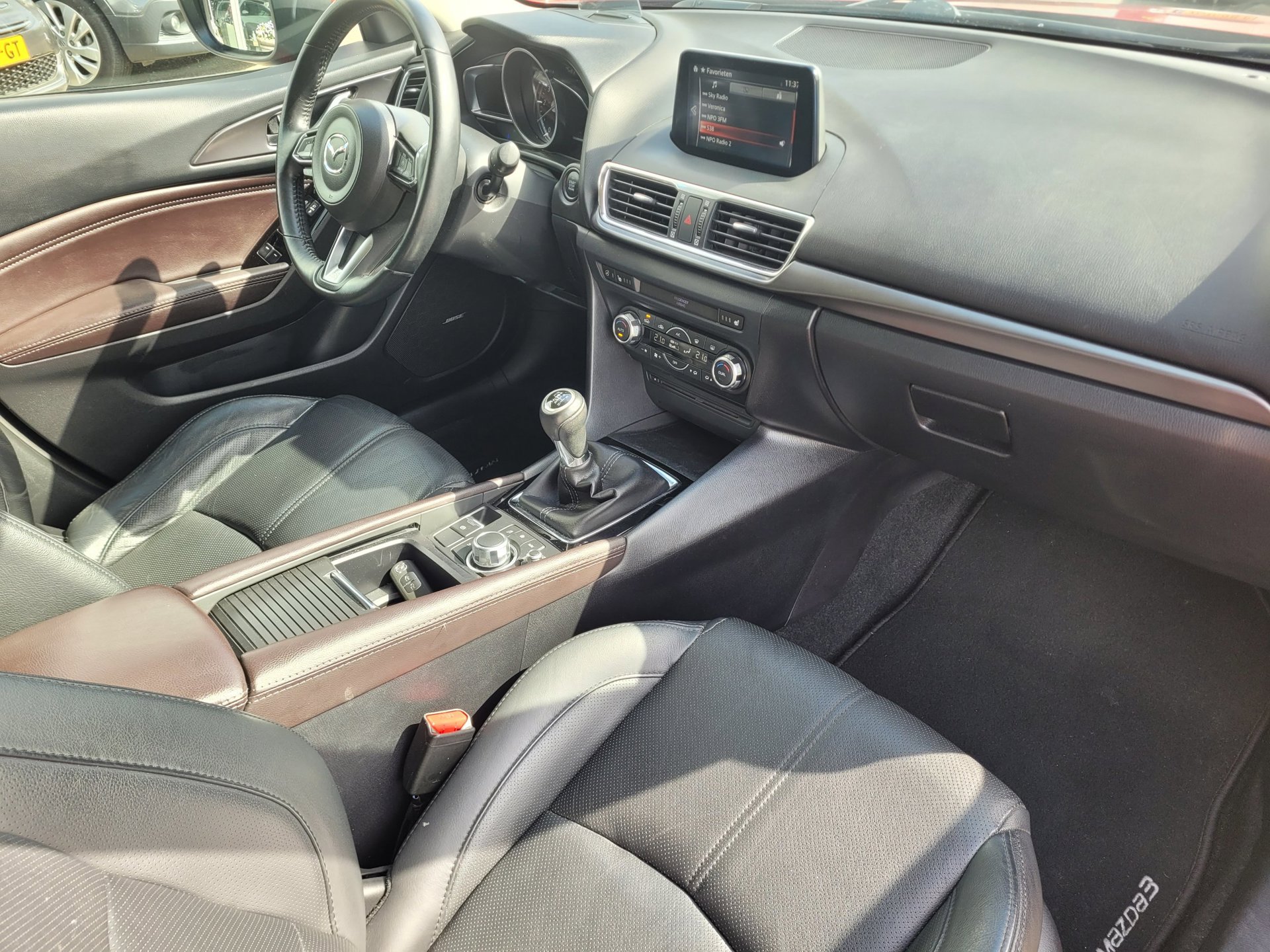 U kunt het audiosysteem met DAB-ontvangst en het navigatiesysteem bedienen met de knoppen op het stuur of zelf met uw stem. U verwacht natuurlijk electronic climate control in deze auto, en die is er dan ook. Boem is ho? Niet bij deze Mazda 3. De piepjes van de parkeersensoren waarschuwen u op tijd voor obstakels. De auto neemt u werk uit handen doordat hij zelf veel in de gaten houdt. Een regensensor en een automatisch inschakelbare verlichting nemen waar wanneer de ruitenwissers en het licht aan moeten. Relaxt rijden is meegeleverd in de vorm van cruise control. De Mazda is standaard voorzien van: automatisch dimmende binnenspiegel, lederen stuur, centrale deurvergrendeling met afstandsbediening, boordcomputer en lederen versnellingspook.
