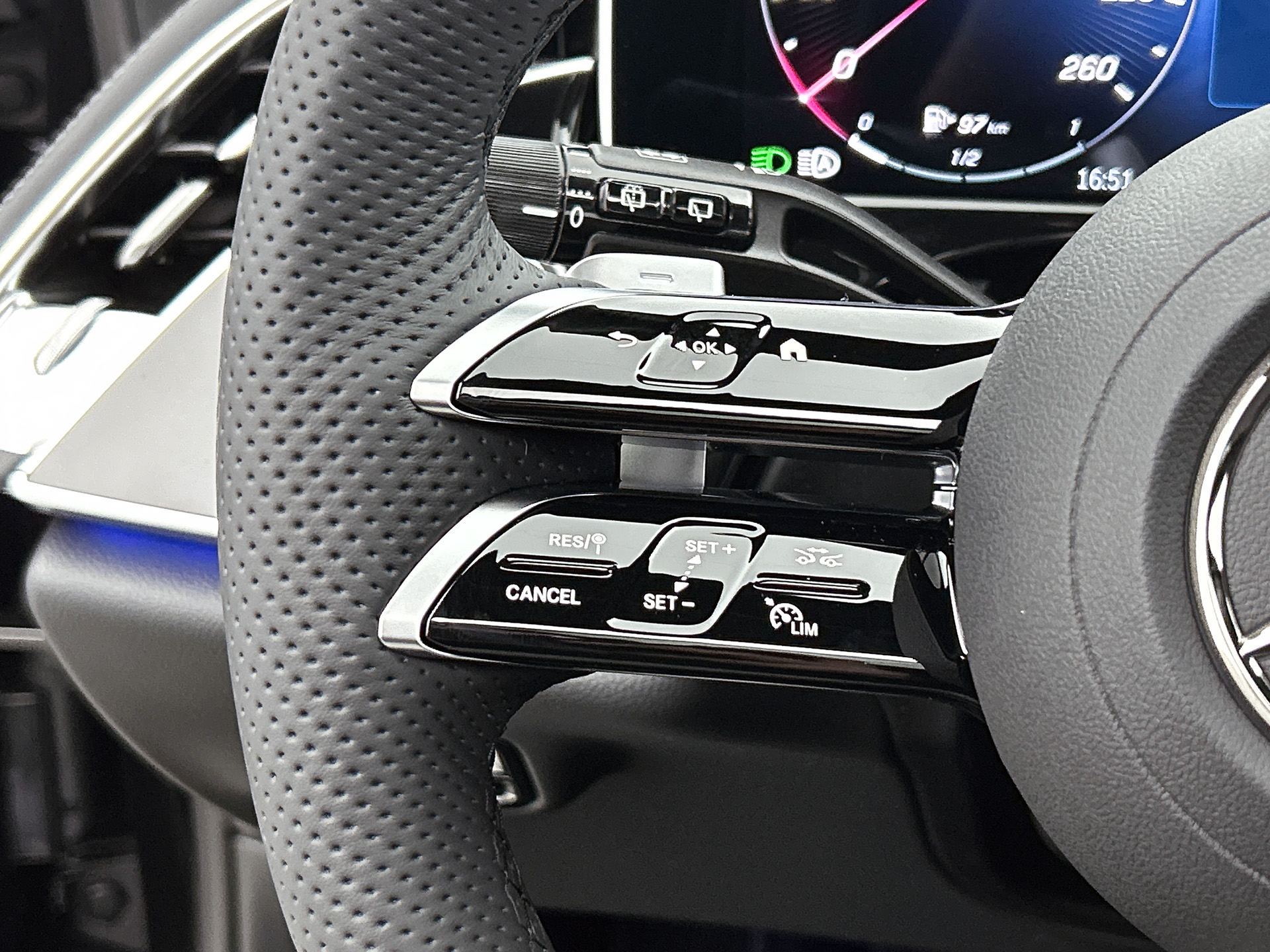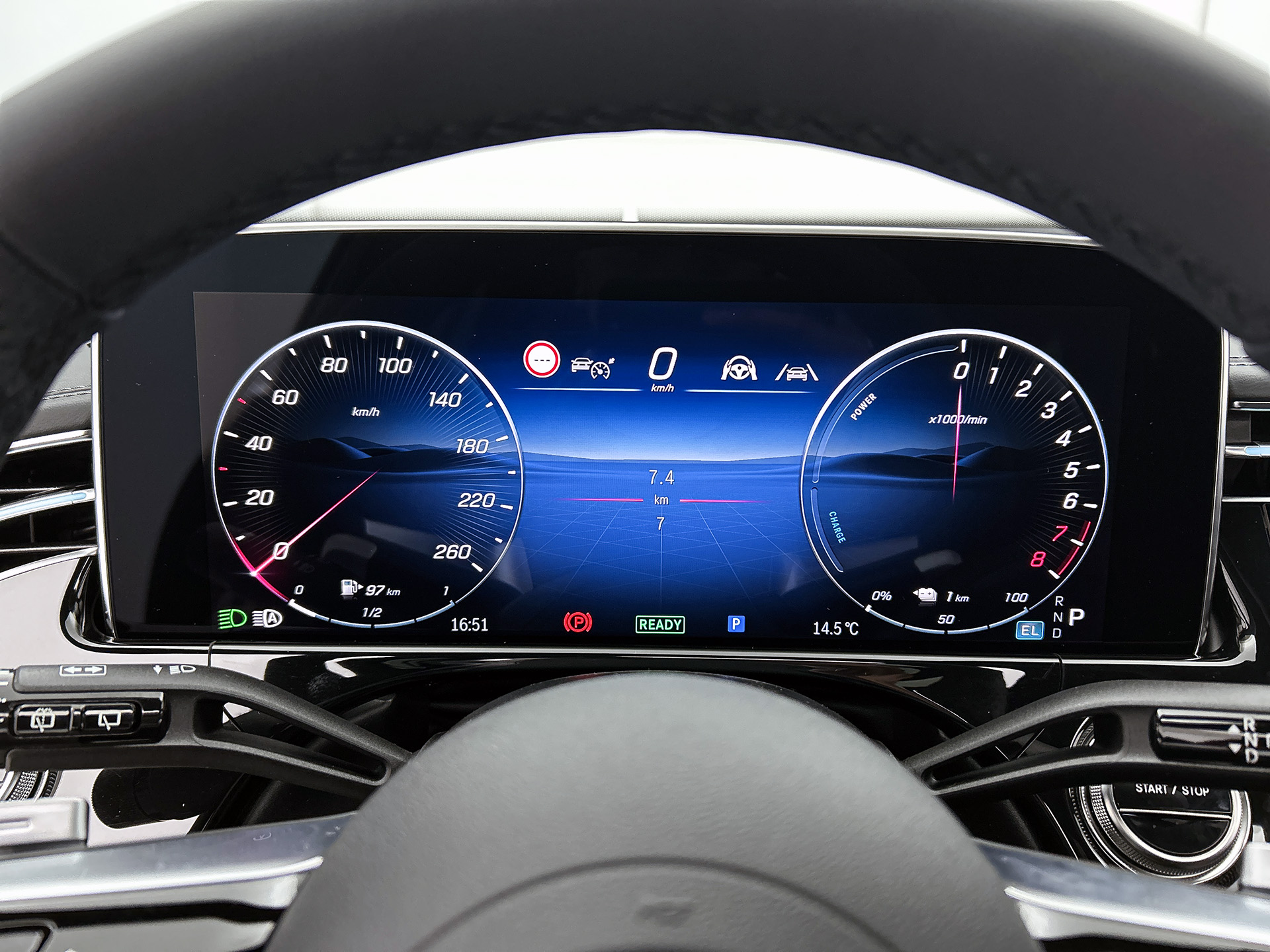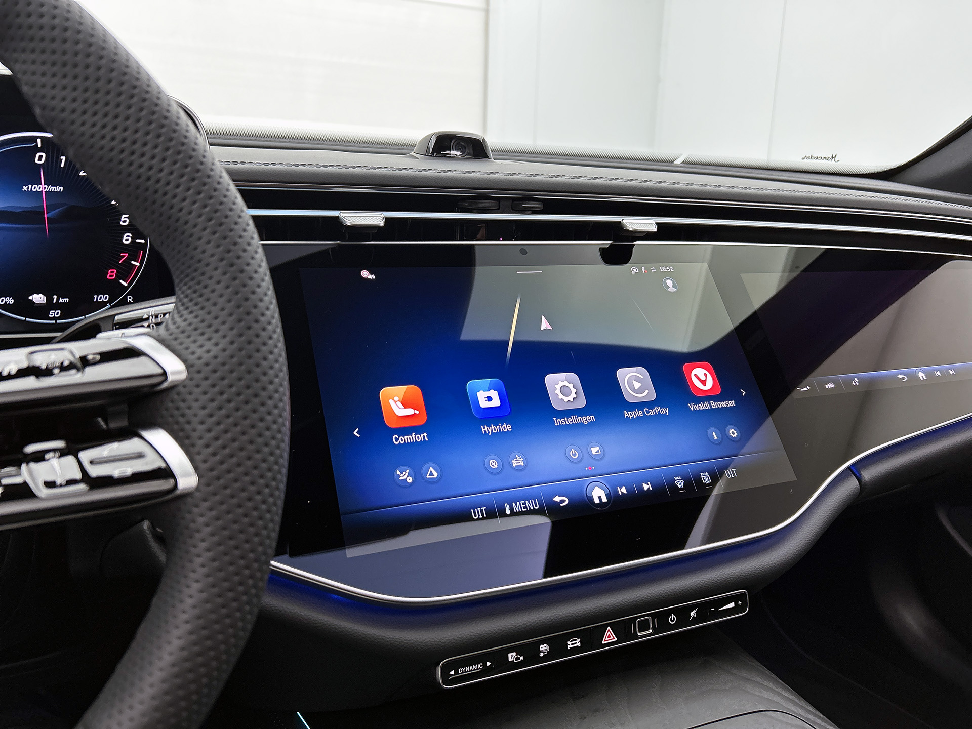 Het zal je verbazen hoe deze auto in staat is om voor jou de omgeving en het verkeer om je heen in de gaten te houden. Jachtvliegers weten het al jaren: belangrijke info projecteer je in je zichtveld zodat je je hoofd niet meer hoeft te draaien. De hier aanwezige head-up display doet precies hetzelfde! Dat de auto steeds meer taken van de bestuurder overneemt, merk je bijvoorbeeld aan het systeem voor verkeersbord-detectie in deze Mercedes-Benz. Onbedoeld buiten de rijstrook raken wordt voorkomen door het Lane-keeping systeem. De auto is ook uitgerust met dodehoekdetector detectiesysteem, forward collision warning system, vermoeidheidsherkenning, autonoom remsysteem en bandenspanningcontrolesysteem.