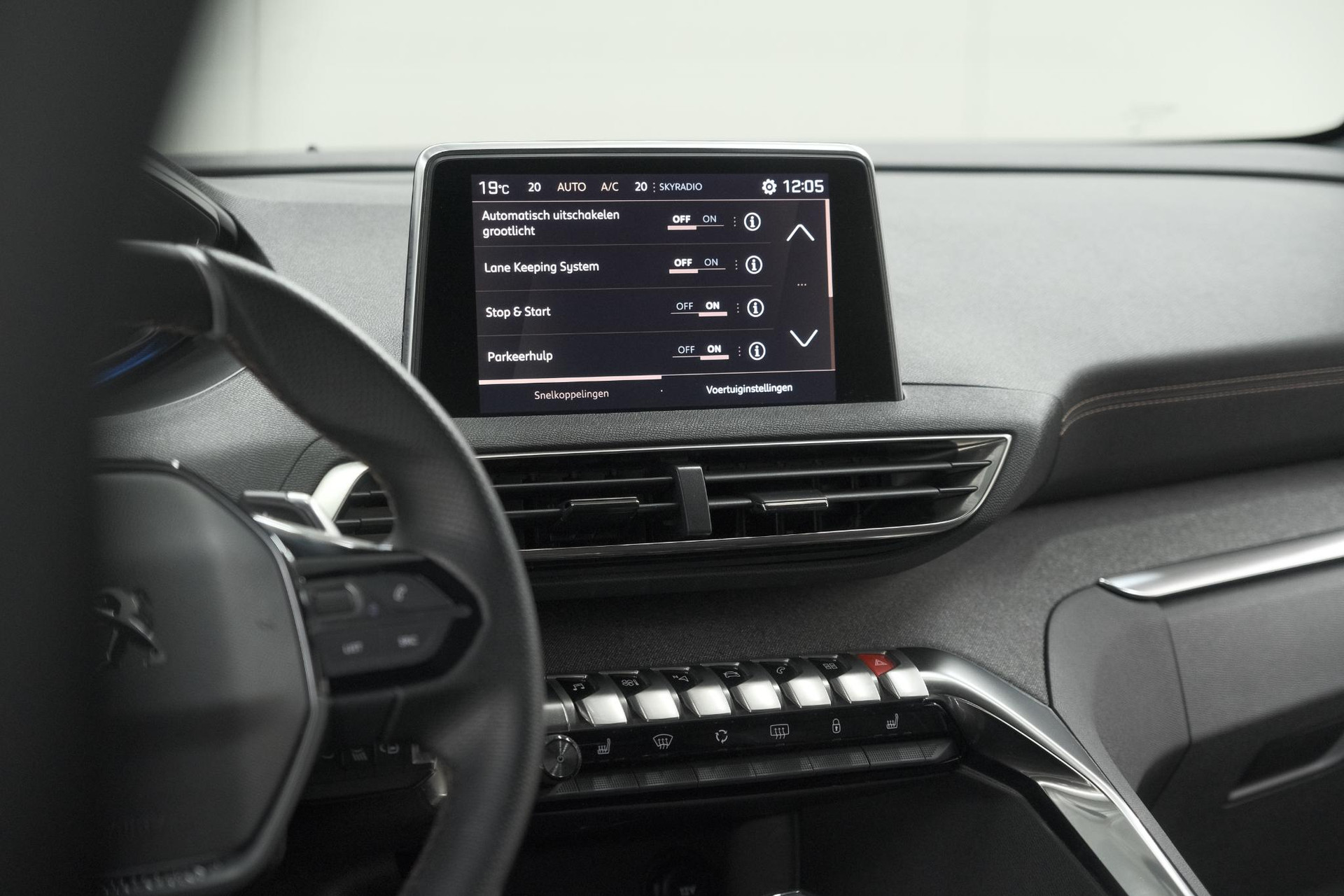Snelheid, omgevingsinfo, navigatie en communicatie... Het digitale dashboard geeft alles realtime weer. Electronic climate control verwarmt of koelt het interieur met een druk op de knop. Volume aanpassen, andere radiozender? U bedient het audiosysteem veilig en handig met de functies op het stuur. De parkeersensoren registreren alles. Ook dat ene paaltje dat net buiten uw gezichtsveld valt. De automatisch inschakelbare verlichting en regensensor zorgen dat onderweg automatisch de verlichting en de ruitenwissers worden ingeschakeld. Daarmee nemen ze u veel werk uit handen. De Peugeot is standaard voorzien van: cruise control, sportstuurwiel, automatisch dimmende binnenspiegel en centrale deurvergrendeling met afstandsbediening.