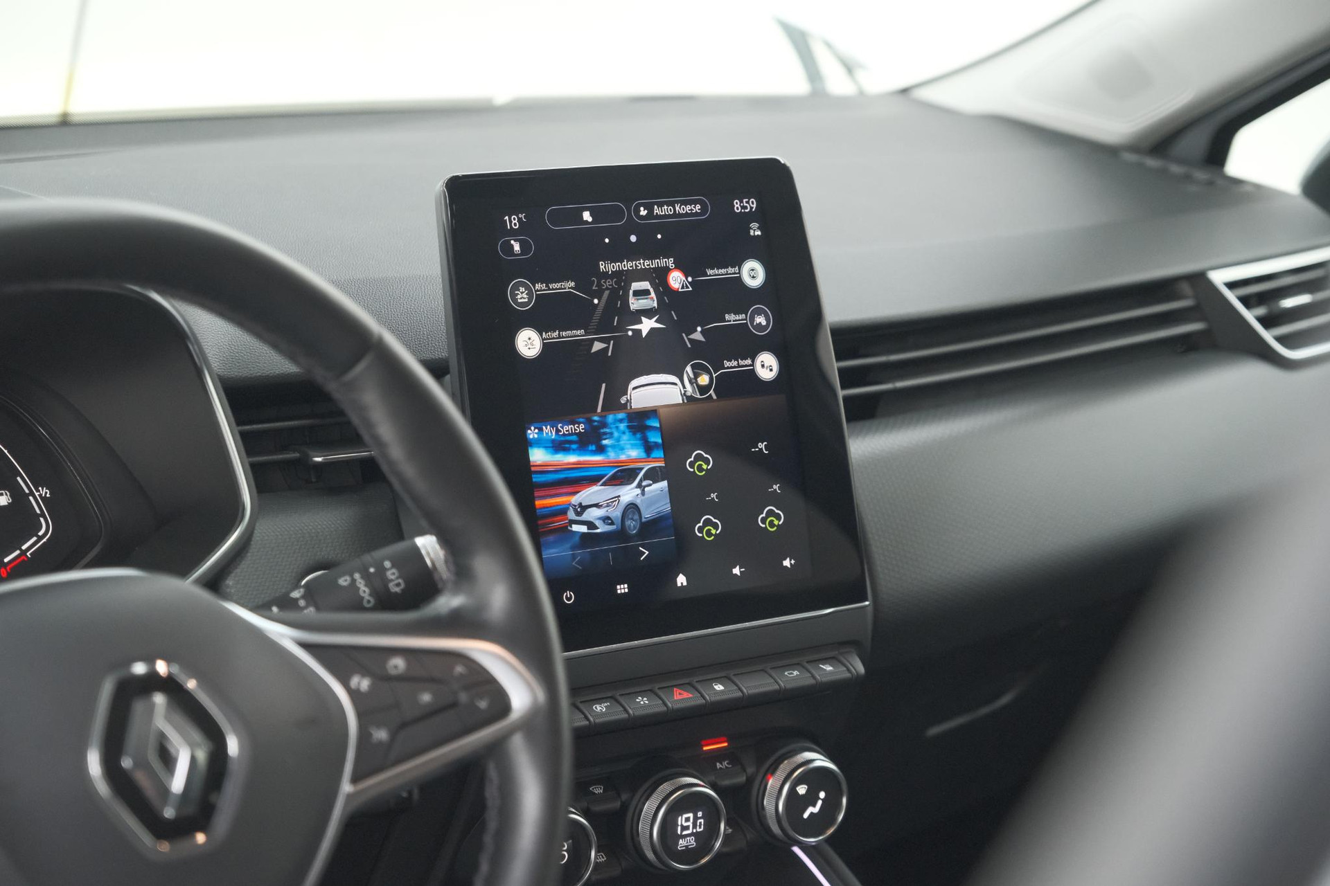 In de Renault Clio heeft uw veiligheid en die van uw omgeving prioriteit. Tijdens de rit hebt u altijd een bijrijder, want de verkeersbord-detectie leest de borden langs de weg en projecteert ze voor u op het instrumentarium. Het Lane-keeping systeem zorgt voor een automatisch constante positie binnen de rijstrook. Afdwalen is uitgesloten. Forward collision warning waarschuwt bij een dreigende aanrijding en vermindert de gevolgen van een ongeval. Met voorzieningen als dodehoekdetectie, hill hold functie, brake assist en bandenspanningcontrolesysteem, bent u altijd veilig onderweg.