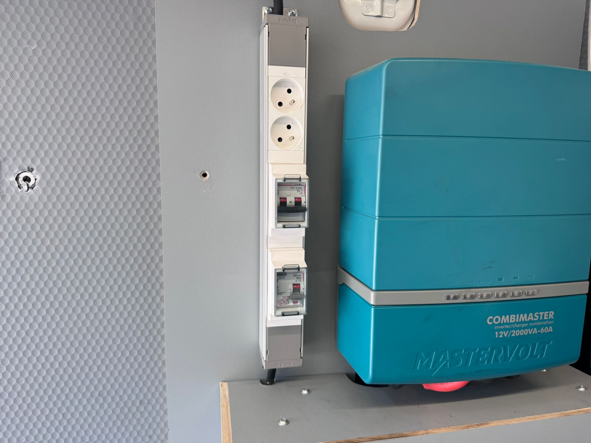 Auto heeft een accuvoorziening met 230v stopcontacten doorheen de bus.