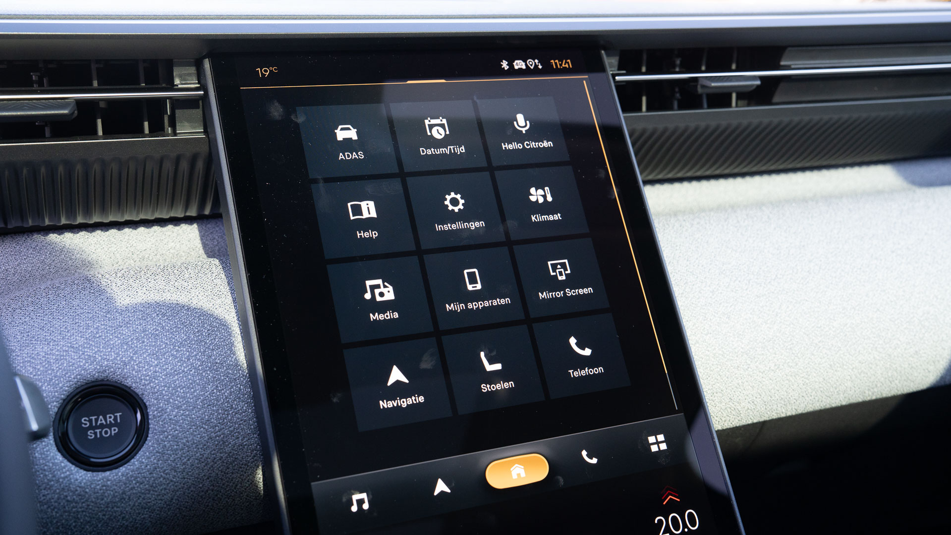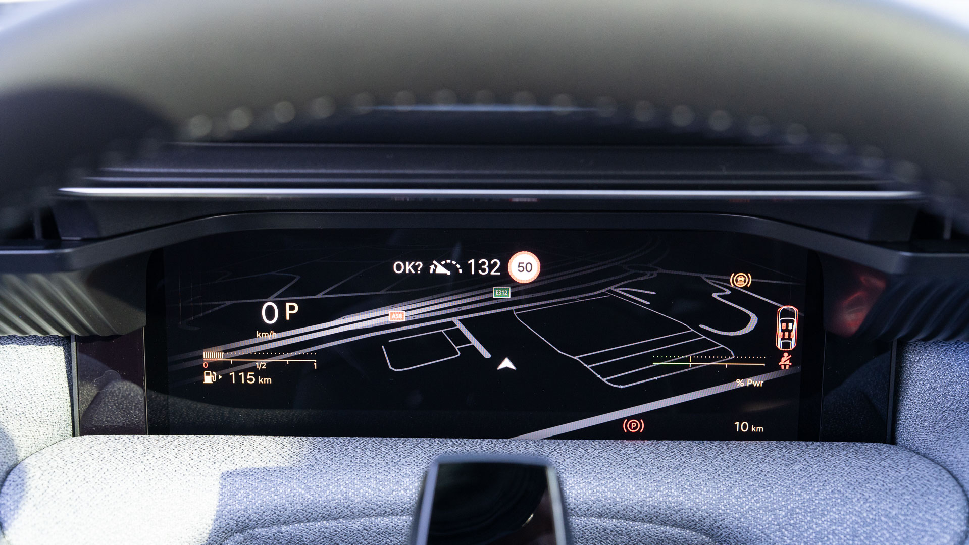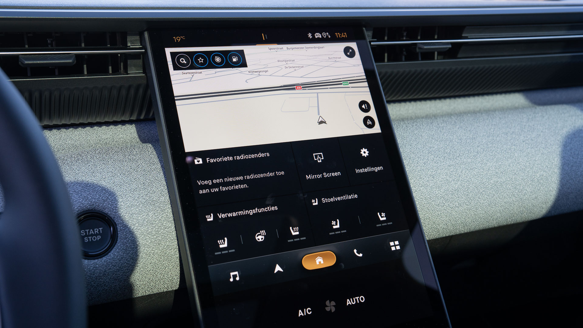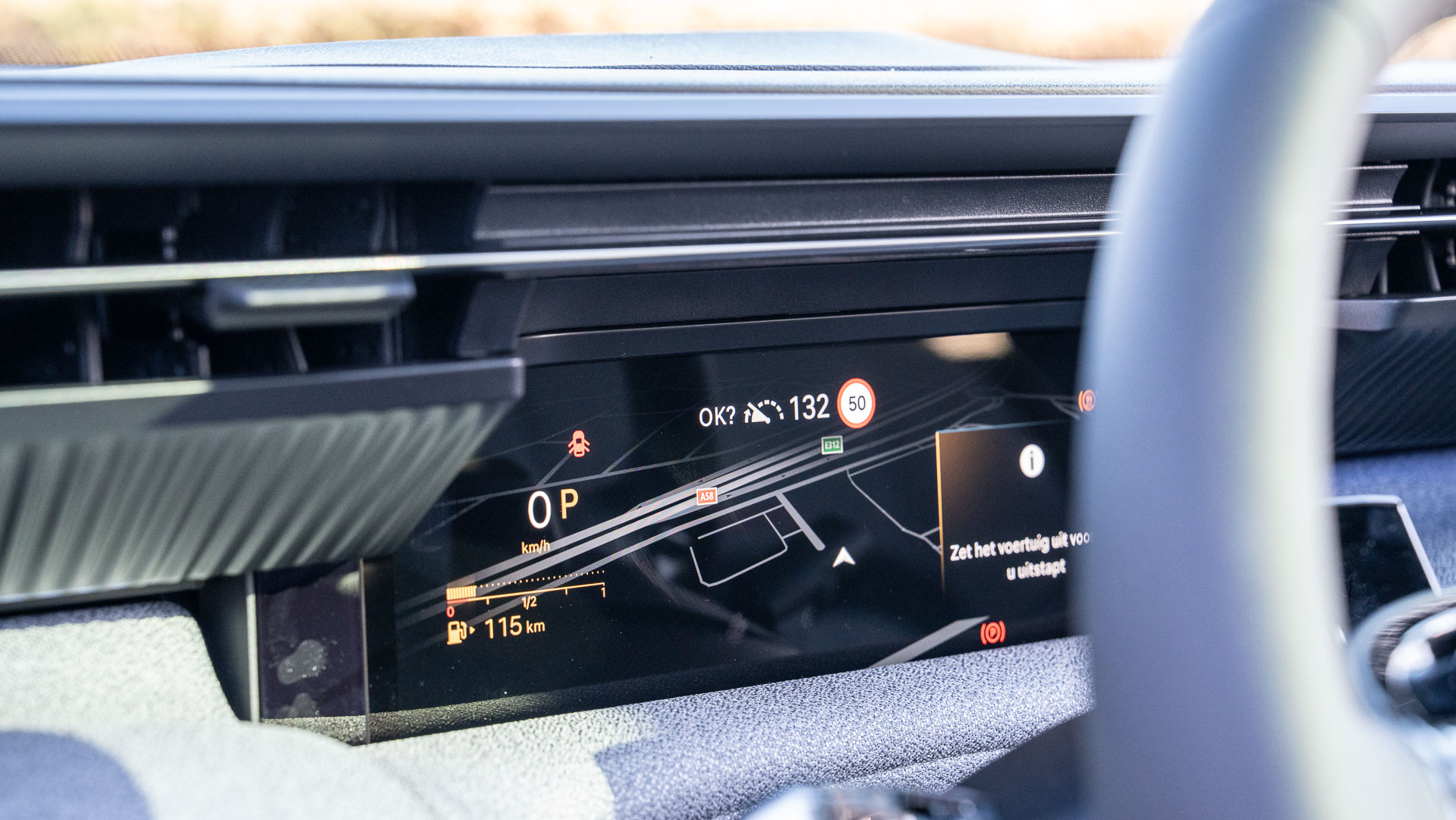 Het stuurwiel is aan de boven–en onderkant afgeplat, het bevat allerlei functies die na enig oefenen op de tast gevonden kunnen worden en dat is erg plezierig, vooral in het donker. Nóg een laatste voordeel: hij is voorzien van een head-up-display en in mijn ogen is dat een onmisbaar onderdeel!