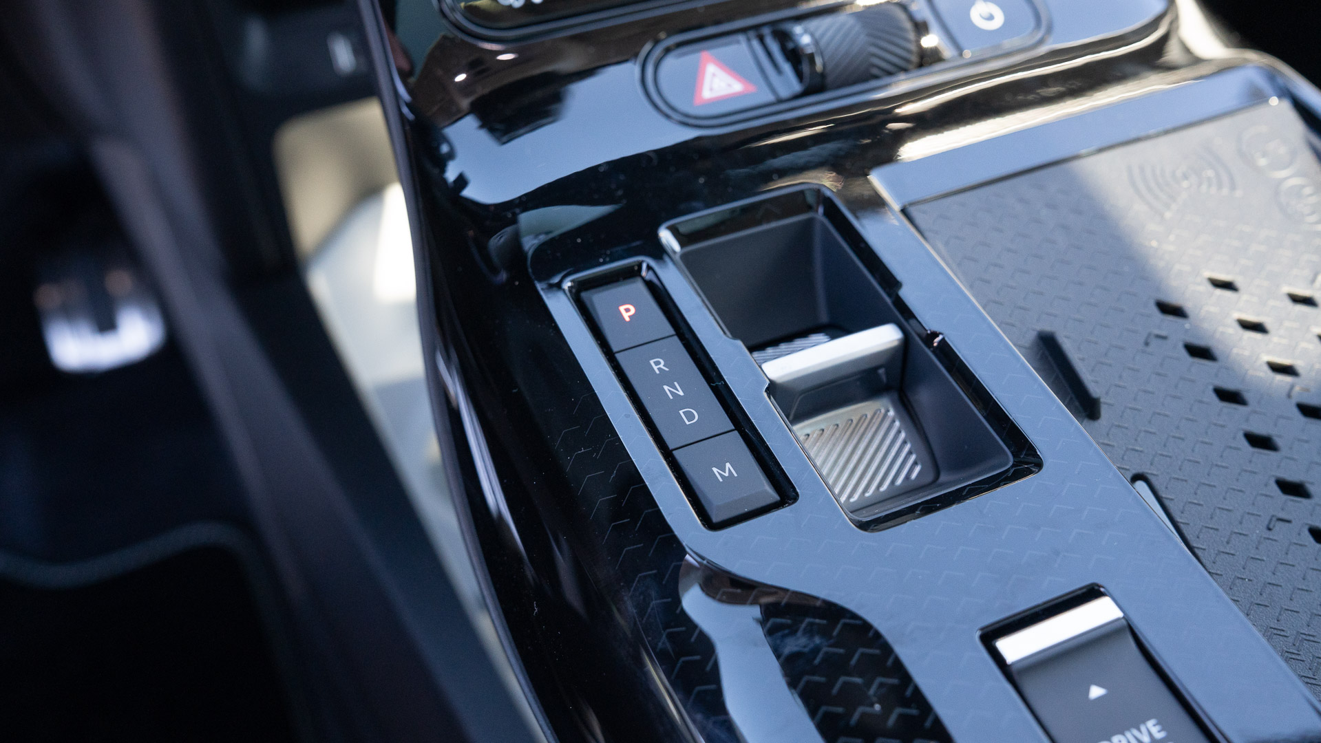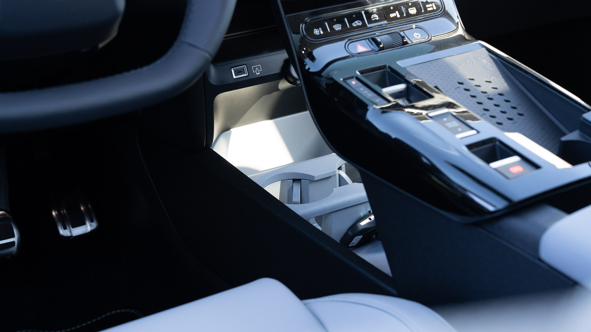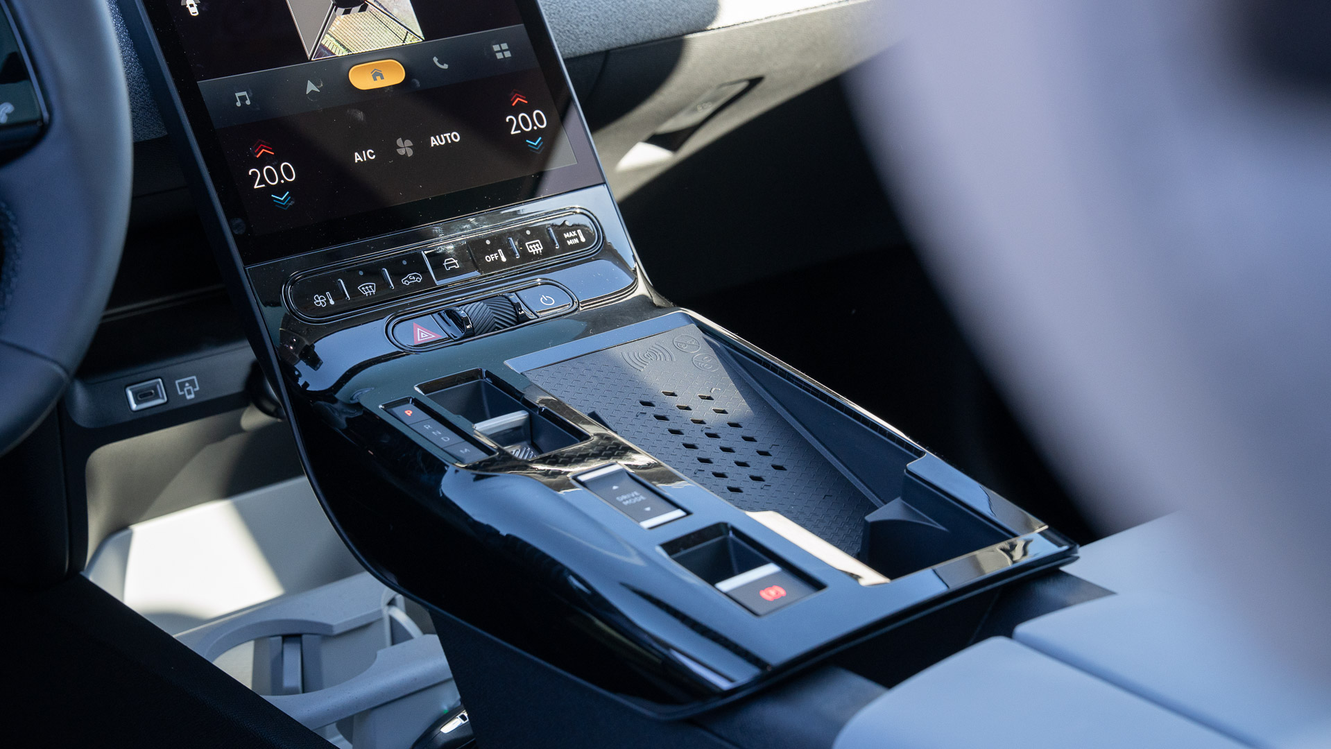Waar de waterval eindigt vloeit hij in één beweging naadloos over in een grote middenconsole die gereserveerd is voor de bediening van de automaat, een schakelaar voor de drivemodus en een ruimte om de smartphone op te laden, gecombineerd met aflegmogelijkheden.