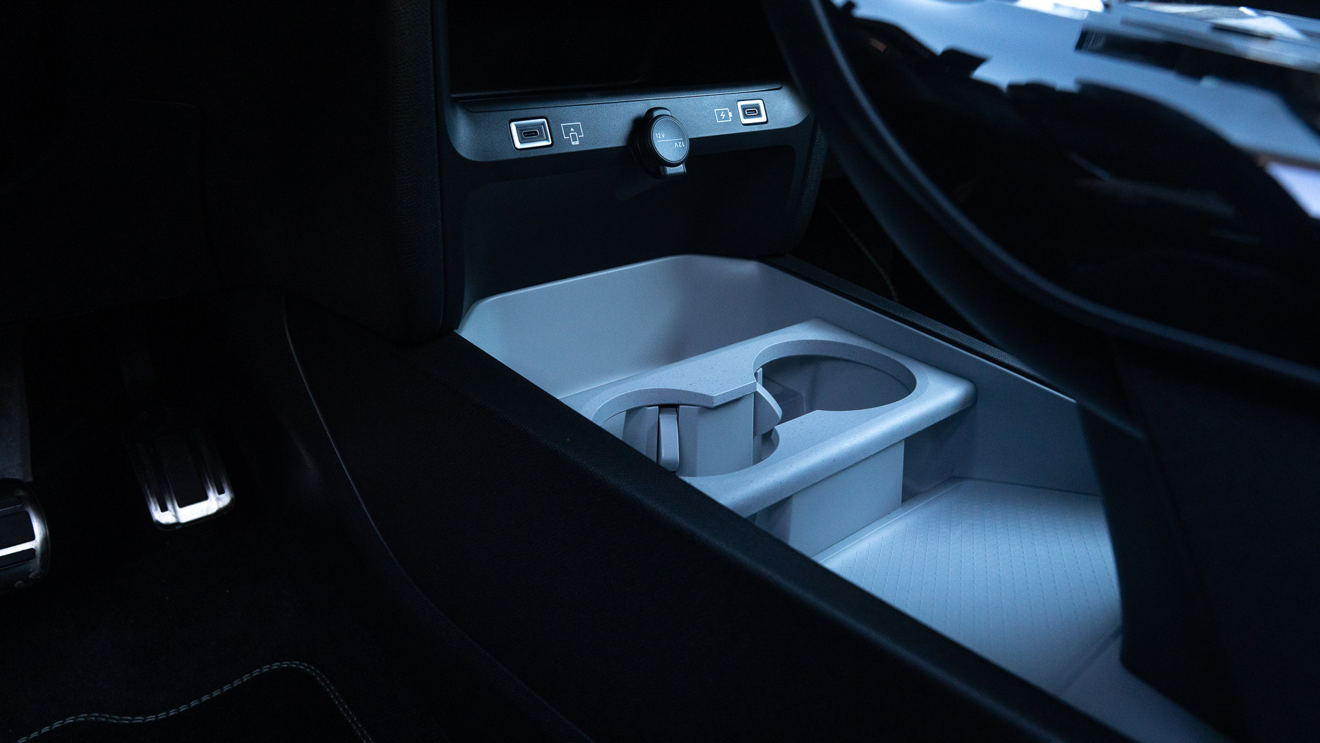 Onder de armsteun tussen de beide voorstoelen is via een druk op de knop nog veel meer opbergruimte te creëren.